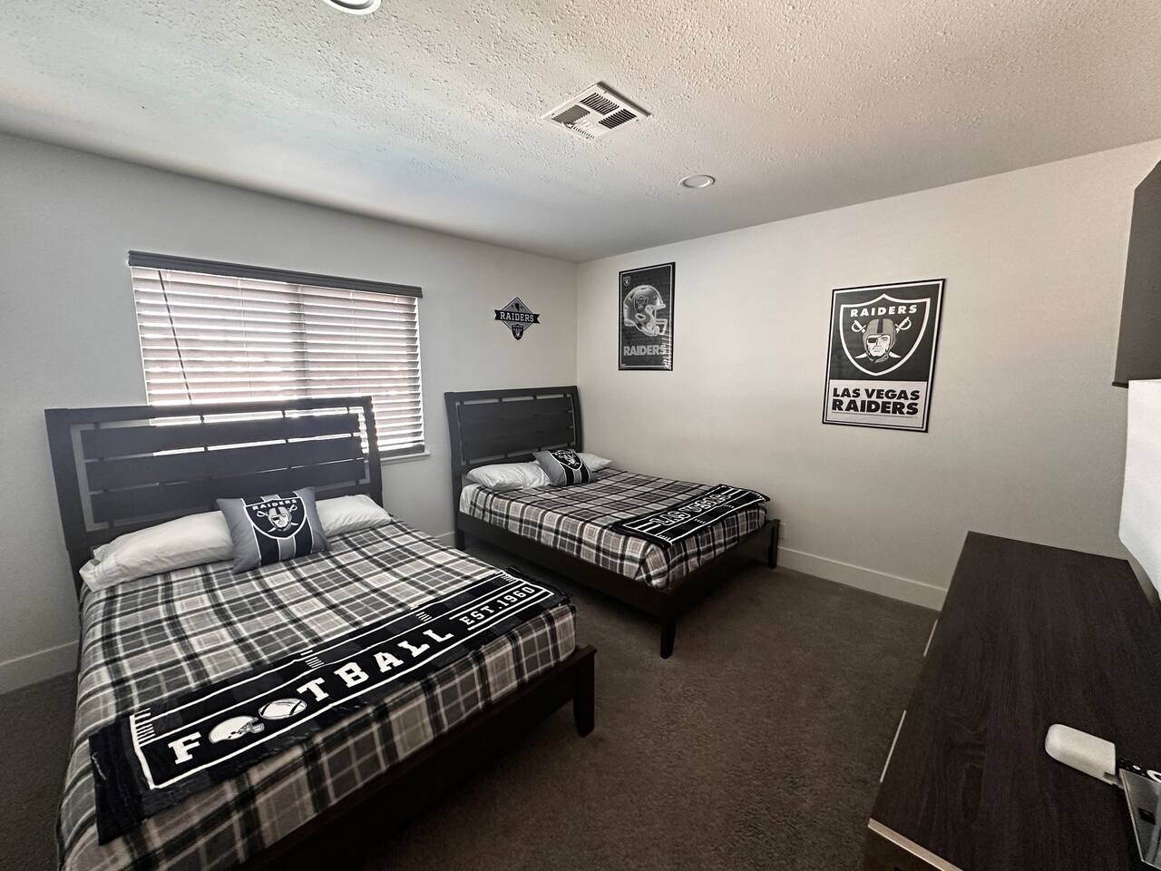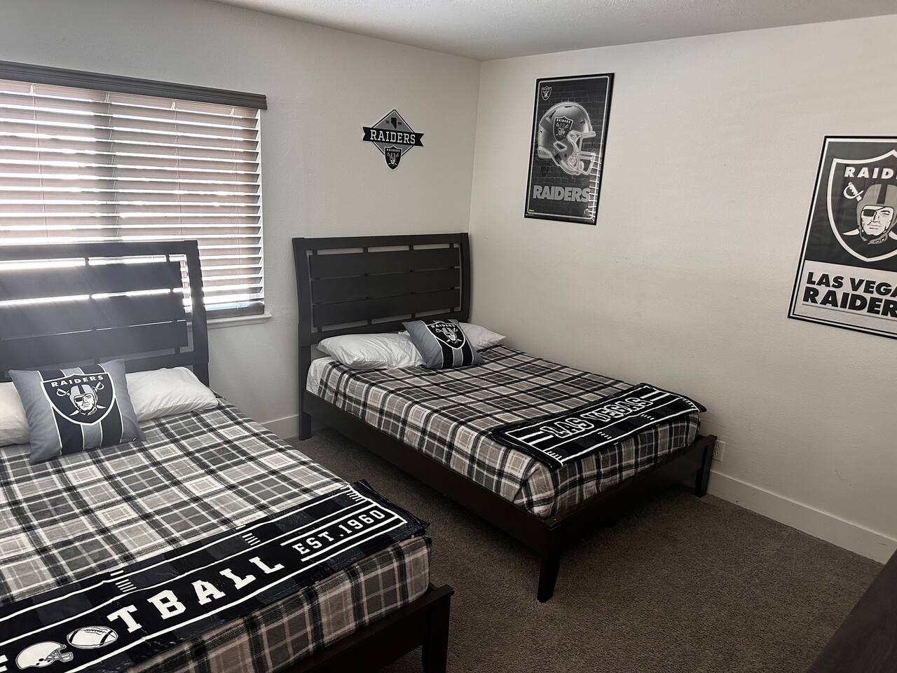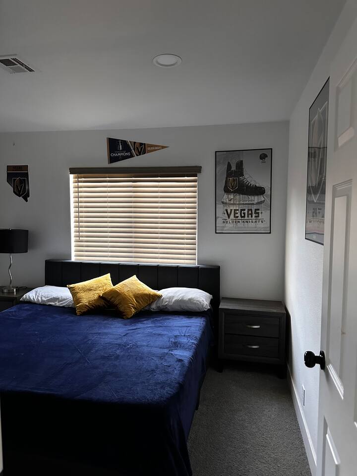 Welcome to YOUR Desert Home!! ✭ ✭ ✭ ✭ ✭ We are so pleased that you have taken the time to consider us for your magical stay in Las Vegas! This cozy, spacious home is equipped with all of the amenities required to make your stay as comfortable as possible with 4 bedrooms, 2.5 bathrooms, and sleeping arrangements for 17 people (15 adults & 2 kids). The pool goes as deep as 8ft with a lovely spa attached for those who crave relaxation and lawn chairs for the perfect nap. Your home away from home is just ✓4.4 miles away from the famous Las Vegas Strip ✓2.1 miles away from Chinatown ✓6.0 miles away from premium outlets ✦KITCHEN✦ Prepare all of your delicious meals using our SPACIOUS kitchen. The lovely Keurig machine is available to start every morning with a fresh coffee. Attached is a dry bar stocked with glassware accompanied by two highchairs, talk about a GOOD TIME! Dining table ready with placemats to enjoy all of your family recipes! ✓ Pots & pans ✓ Keurig coffee machine ✓ Refrigerator/ freezer ✓ Microwave ✓ Dishwasher ✓ Utensils ✓ Silverware ✓ Glassware ✓ Plates & bowls ✓ Stove ✓ Oven ✓ Toaster ✦LIVING ROOM✦ Sit back and relax on the oversized L-shaped couch while binge-watching your favorite Netflix shows! Rally up your friends and family for a night of board games around the living room table. ✓ Comfortable seating ✓ 50" TV with Netflix and airplay ✓ Boardgames for all ages ✓ Stylish coffee table ✦BEDROOMS - 4bedrooms ✦ Snuggle up in comfortable beds and pillows with soft linen and sheets. Ample closet and dresser space for your belongings including a walk-in closet in the primary bedroom. All bedrooms are equipped with 50" TVs (Netflix, AirPlay). Tune into your VEGAS SPIRIT with our RAIDERS and GOLDEN KNIGHTS themed bedrooms! ❉Primary: 2 Queens (sleeps 4 adults) ❉Room 2: 1 King (sleeps 2 adults and 2 children) - GOLDEN NIGHTS THEME ❉Room 3: 2 Full size (sleeps 4 adults) - RAIDERS THEME ❉Room 4: 1 full, 3 Twins (sleeps 5 adults) ❉❉ Total sleeping capacity: 17 (15 adults and 2 children) All bedrooms offer: ✓ Top quality pillows, linen & sheets ✓ Nightstand ✓ 50" TV ✓ Dresser ✓ Closet w/ hangers *Please ask for any special sleeping arrangement requests* Primary room has paper shades to help block out light. ✦BATHROOMS✦ Experience luxury with high-end "shower panels" equipped with massage jets. Both full bathrooms have this high-end technology. The primary bathroom offers lots of space and storage for you and your guests. Bathrooms stocked with essential toiletries. ✓ Standing showers ✓ Mirror ✓ Towels ✓ Hair dryers (2) ✓ Toilet ✓ Essential toiletries 1 towel per guest + 2 extra towels will be provided. contact us if extra towels are needededwd ✦OUTSIDE ✦ Relax after a fun day of exploring the sights of Las Vegas in Our Desert Home oasis backyard. HUGE pool, restful spa, spacious backyard, reclining chaise lounge chairs, outside table and BBQ! Watch the sunset as you lay beside the pool on the wonderful reclining chaise lounge chairs provided. Enjoy FRESH limes from our lime tree!! HEATING AVAILABLE: only SPA $150/ 8hr window (12hr window of your choice) - hot summer months (May-September) ✓ Pool -8ft ✓ Spa (attached to the pool) ✓ Table w/ chairs & umbrella ✓ Reclining chaise lounge chairs ✓ Gas BBQ PLEASE close umbrella when not in use and during high winds. ✦LOTS OF ONSITE PARKING ✦ The driveway fits 2 cars. The side of the house offers a COVERED parking space for 2 cars. On-street parking is also available. NO GARAGE ACCESS ✖ NO PARTIES/ EVENTS ✖ We truly wish you a wonderful time but out of respect for our neighbors and the safety of our home, we do not allow parties. Please be mindful of quiet hours after 9 pm. With this said, we want you to have a great time! ✖ NO SMOKING ✖ Please refrain from smoking inside the property. Any smoke odor presence will result in a $800 deep cleaning fee. ✖ NO PETS